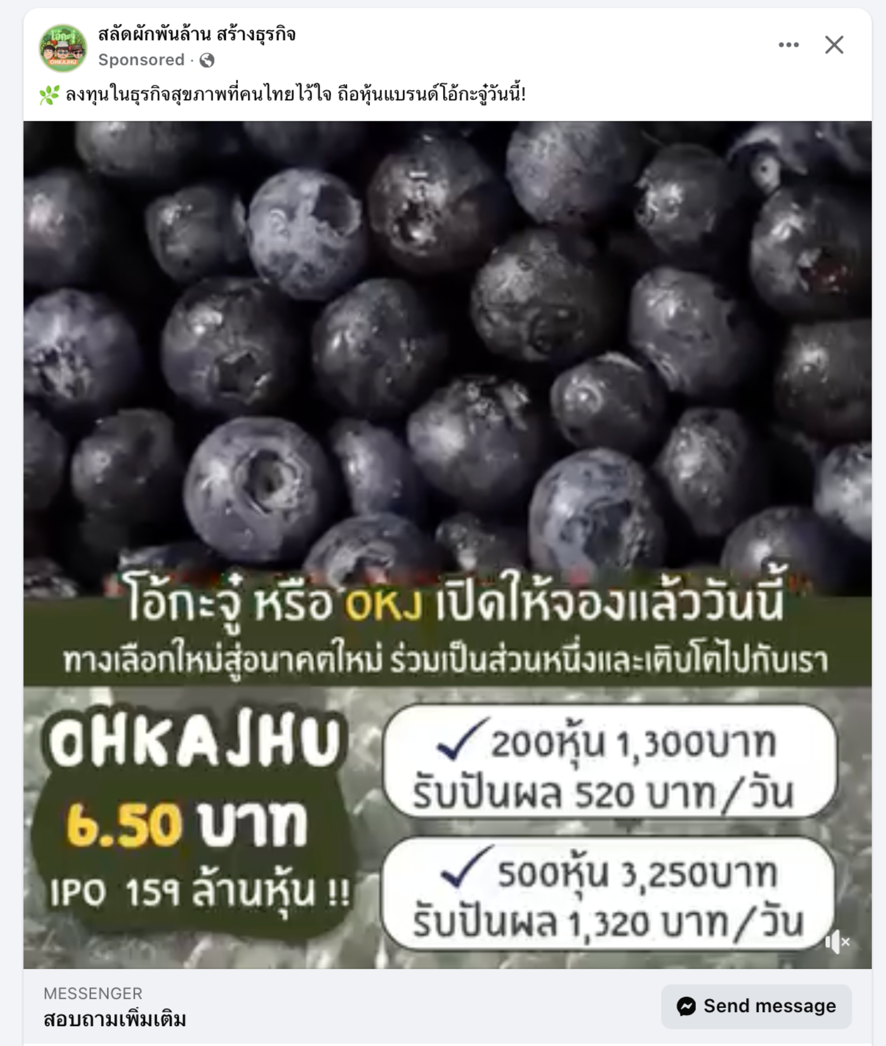 ข้อความโฆษณาเชิญชวนให้ลงทุนในธุรกิจสุขภาพของแบรนด์โอ้กะจู่ (OKJ) โดยเปิดให้จองหุ้น IPO จำนวน 159 ล้านหุ้น ที่ราคาหุ้นละ 6.50 บาท มีการระบุผลตอบแทนเป็นปันผลรายวันตามจำนวนหุ้นที่ถือ เช่น ถือ 200 หุ้น ลงทุน 1,300 บาท ได้รับปันผล 520 บาทต่อวัน และถือ 500 หุ้น ลงทุน 3,250 บาท ได้รับปันผล 1,320 บาทต่อวัน